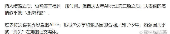一家三口这时候还是非常幸福的,经常蜜里调油秀恩爱,夫妻俩感情不断升温。2024年,他们迎来二胎,爱丽丝生下女儿,凑成一个“好”,3年抱俩这速度可以说非常快了。赖弘国发布母女合照,妻子脸上洋溢着幸福的笑容。